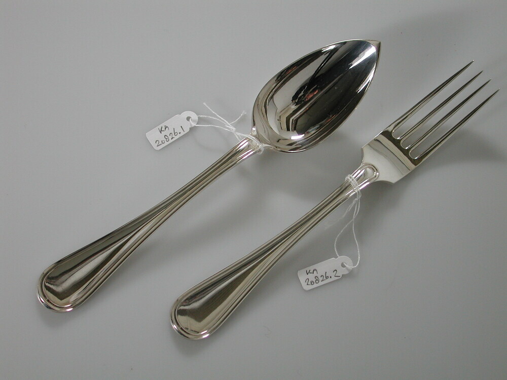 Tafelcouvert, stelen met ronde steelkoppen, puntig ovale lepelbak en hoekige spiegel bij de vork. Voorzijde steel met dubbele opwaartse filet, in de kop en het knopje doorlopend. Achterzijde met dubbele in de kop doorlopende opwaartse filet met gotisch lof.