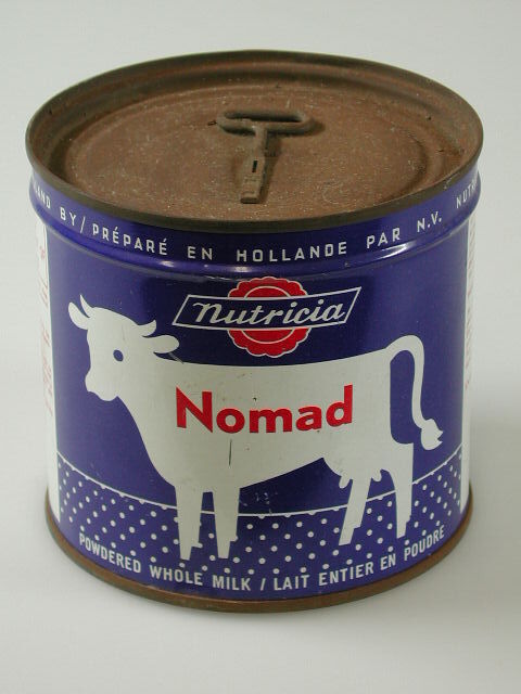 Rond blik waarin volgens opschrift melkpoeder zit, merk: Nomad.- Trefwoorden
