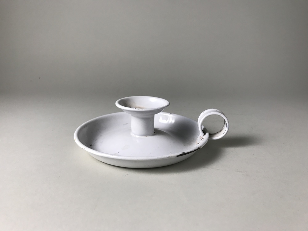 Wit geverfde lage kandelaar met schaaltje als voet, voorzien van ringvormig oortje.- Trefwoorden