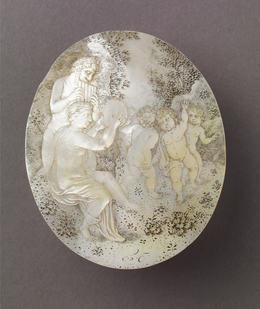Deze parelmoer schelp is gedecoreerd met een gesneden, gegraveerde en deels gezwarte mythologische voorstelling. Parelmoersnijden was omstreeks 1700 een geliefde kunstvorm. Met name het geslacht Bellekin bracht een aantal getalenteerde parelmoersnijders voort. Van hen was Cornelis de bekendste. Werk van hem was al tijdens zijn leven gezocht bij verzamelaars. Een van hen was de Amsterdamse apotheker en verzamelaar Albertus Seba (1665-1736). Seba's collectie 'rariteiten' was in zijn tijd beroemd bij vorsten, geleerden en verzamelaars in binnen- en buitenland. In 1716 verkocht hij zijn hele verzameling aan tsaar Peter de Grote, waarna hij opnieuw met collectioneren begon. Seba bezat meerdere schelpen van Bellekin. Het onlangs door het AHM verworven exemplaar is uit zijn tweede - in 1752 geveilde - verzameling afkomstig. Tussen 1734 en 1765 liet Seba zijn complete collectie naturalia in een vierdelige catalogus of 'Thesaurus' publiceren. Deze schelp is in het derde deel afgebeeld (Plaat LXXXV, no. 9) en beschreven (p. 177): 'Drie kindertjes dansende op het geluit, dat een Bos-God en Bos-Godinne op hunne instrumenten maken.' Verworven met een speciale gift van de gemeente Amsterdam en steun van de Vereniging Rembrandt