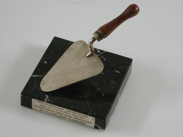 Zilveren troffel met houten handvat. Troffel is met staafje op klein plateau van marmer bevestigd. Op voorzijde van plateau zit zilveren tekstbordje met tekst TER HERINNERING AAN HET SLAAN/VAN DE EERSTE PAAL VOOR HET/ TRANSITORIUM I DER VRIJE UNIVERSITEIT/ OP 19-1-1976 DOOR H.LAMMERS