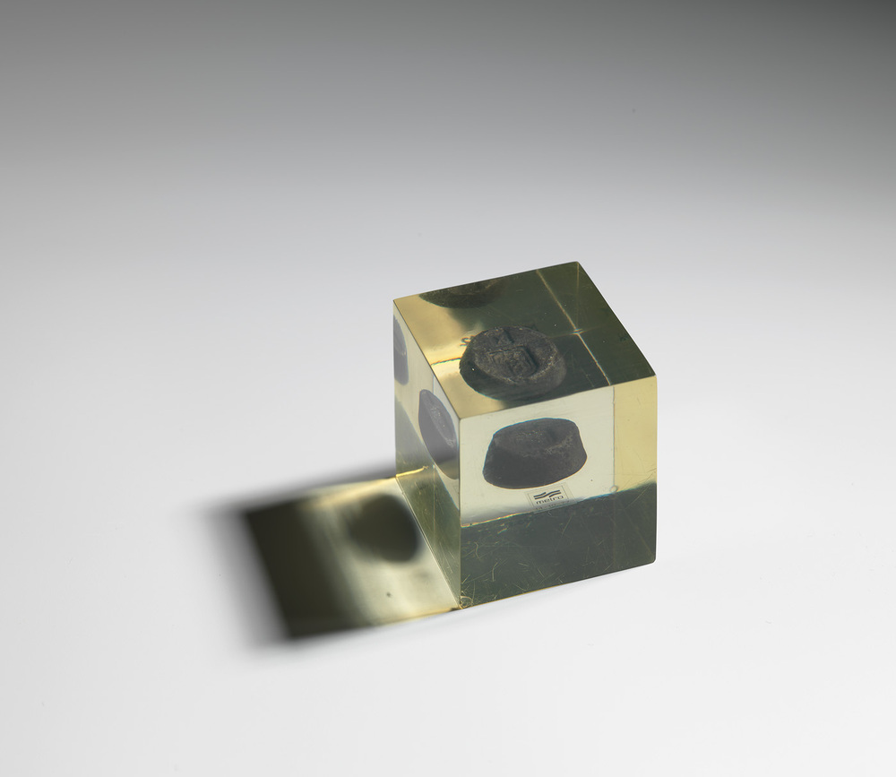 Replica van loden gewicht (vgl. inv.nr. Arch. Dienst MW 7-10), gegoten in vierkanten kubus van doorzichtige kunsthars. Meegegoten is ook het logo van de metro en de herinneringsdatum 14-10-1977.