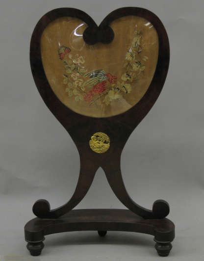Halvemaanvormig voetstuk, op drie bolpootjes. Twee uitgebogen stijlen, versierd met koperen rozetjes, dragen het hartvormige scherm, waarin verbleekte petit-point (papegaai in bloemen).- Trefwoorden