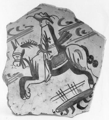 middenstuk met vrij primitieve voorstelling van een ruiter op springend paard- Trefwoorden