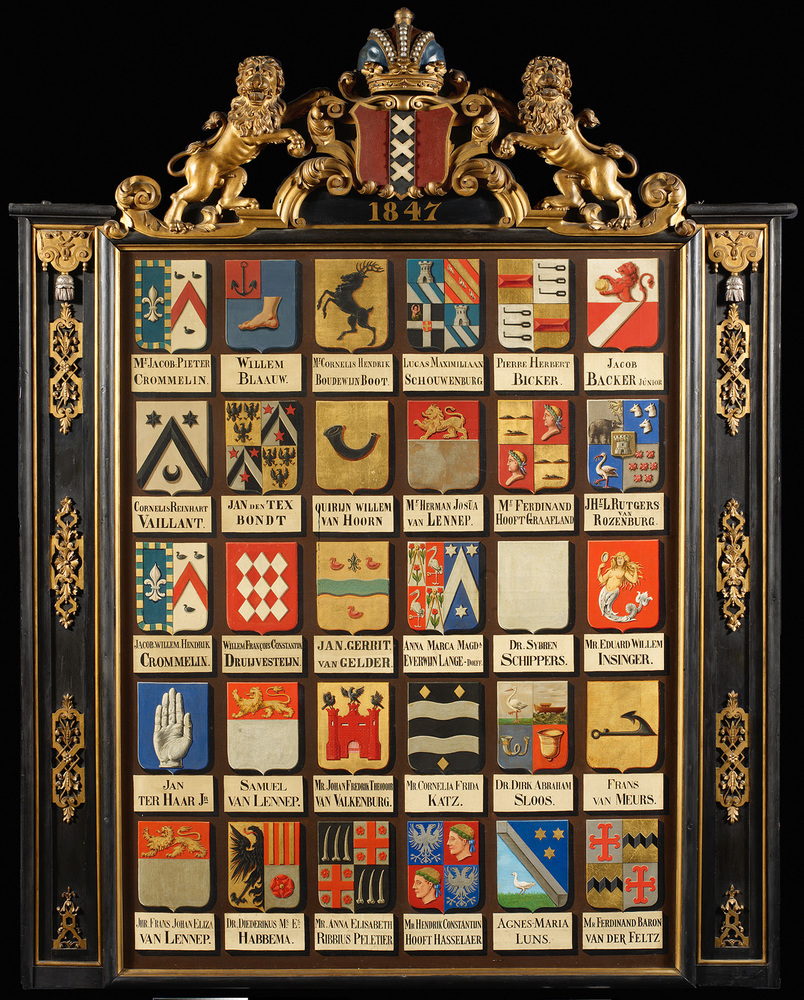 In het Amsterdamse Burgerweeshuis konden kinderen van Amsterdamse poorters (burgers met rechten om in de stad te wonen) terecht, die geen ouders of een moeilijke thuissituatie hadden. Het algemene bestuur van het Burgerweeshuis was in handen van zes regenten en vier regentessen. Hoewel zij regelmatig in het weeshuis aanwezig waren, elk met eigen vergaderruimten in het gebouw, zullen vooral de regenten voor de kinderen beperkt in beeld zijn geweest. Het was dan ook voor een deel een prestigefunctie. In de regentenkamer hingen drie wapenborden, waarop de wapens van de regenten uit de achttiende en negentiende eeuw afgebeeld zijn. Dit wapenbord toont de regenten Crommelin tot en met Van der Feltz, uit de periode 1847 tot 1890. ( Sarah Remmerts de Vries)