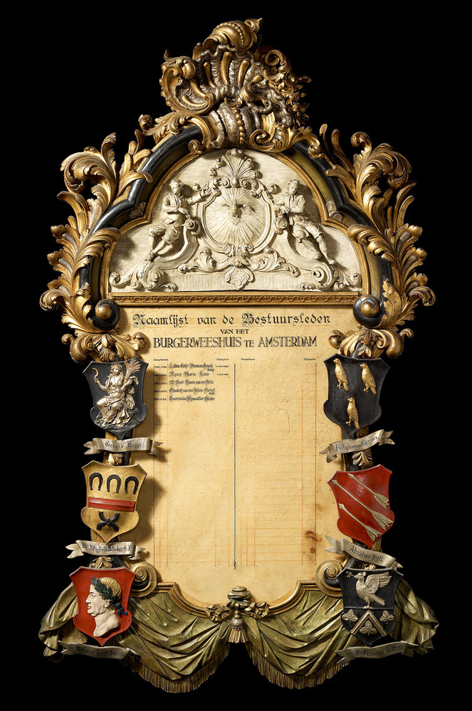 In het Amsterdamse Burgerweeshuis konden kinderen van Amsterdamse poorters (burgers met rechten om in de stad te wonen) terecht, die geen ouders of een moeilijke thuissituatie hadden. Het algemene bestuur van het Burgerweeshuis was in handen van zes regenten en vier regentessen. Hoewel zij regelmatig in het weeshuis aanwezig waren, elk met eigen vergaderruimten in het gebouw, zullen vooral de regenten voor de kinderen beperkt in beeld zijn geweest. Het was dan ook voor een deel een prestigefunctie. In de regentenkamer hingen namenlijsten van de regenten en bestuurders van het Burgerweeshuis, ingezet in rijkelijk gedecoreerde wapenlijsten. Bovenaan de wapenlijst is een voorstelling van twee weesjongens te zien, die het symbool van het Burgerweeshuis (een duif binnen een stralenkrans) flankeren. Binnen de wapenlijst bevindt zich een namenlijst van recenter datum. ( Sarah Remmerts de Vries)