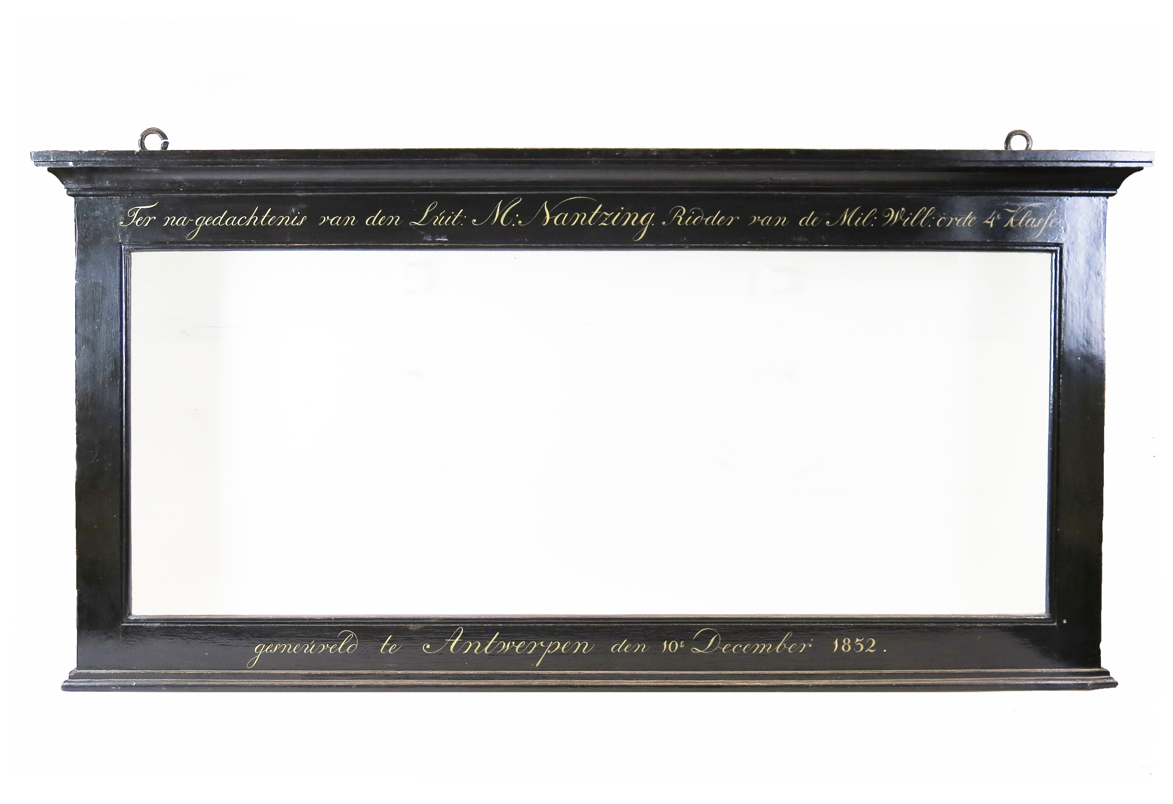 opschrift boven- en onderzijde lijst: Ter na-gedachtenis van den Lúit: M: Nantzing. Ridder van de Mil: Will: orde 4e Klasse/ gesneúveld te Antwerpen den 10e December 1832.