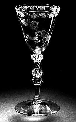 Op de kelk twee gevleugelde putti. E‚n putto perst een druiventros uit, terwijl de ander de drinkschaal ophoudt. Hieronder een tekstlint met het opschrift: AMICITIA/. Op bovenzijde voet in diamantgravure gesigneerd en gedateerd: Jacob Sang, inv: et Fec: Amsterdam, 1760,/. ( Annemarie den Dekker)