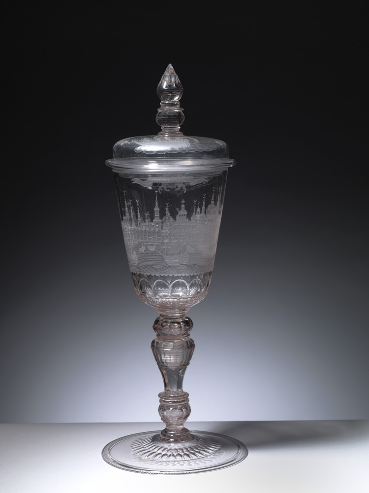 Radgravure door een onbekende Saksische glasgraveur met een panorama van Amsterdam, gezien vanaf het IJ.