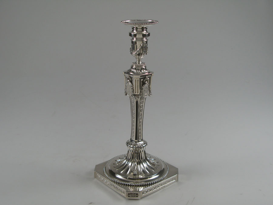 Kandelaar met vierkante voet, zich verwijdende stam en ronde, vaasvormige kaarsenhouder. Voet en stam met afgeschuinde, uitspringende hoeken. Basis voet met vier velden, elk met samengebonden laurierbladeren, de uitspringende hoeken met rozetten. Rond, zich verjongend middendeel met cannelures, alternerend met vier afhangende slingers van laurierbladeren met bessen. Nodus met eierlijst en parelrand op overgang voet en stam. Zijden stam met vier velden, elk met schubbenmotief. Bovenzijde stam met blokvormig kapiteel, de afgeschuinde hoeken gecanneleerd.
