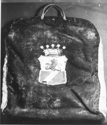 Zwarte wollen reistas met twee leren handvatten, en bruine leren zijkanten. Op de ene zijde een monogram CHB geborduurd, op de andere zijde het wapen van de familie Backer geborduurd. De tas is met wit met bruin gestreept linnen gevoerd.- Trefwoorden