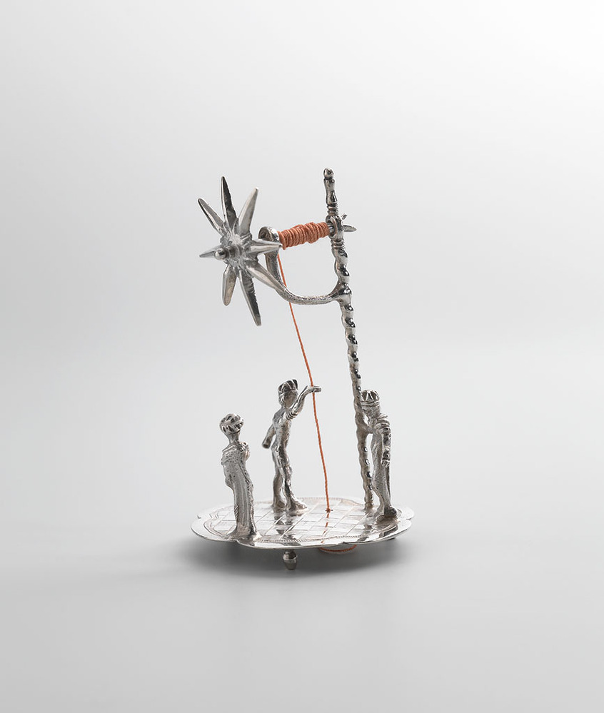 Driekoningen is een christelijke feestdag die vanouds elk jaar op 6 januari wordt gevierd. Men herdenkt dan dat drie koningen, de Wijzen uit het Oosten, een lichtende ster zagen die hen de weg wees naar Bethlehem waar Jezus was geboren. Deze miniatuur beeldt de avond voor Driekoningen af, wanneer kinderen in groepjes van drie verkleed als koning zingend langs de huizen gaan. De figuurtjes dragen een grote lampion in de vorm van een ster met zich mee. De ster kan draaien door aan een touwtje te trekken, in het echt én in het zilveren voorwerpje. ( Bert Vreeken)