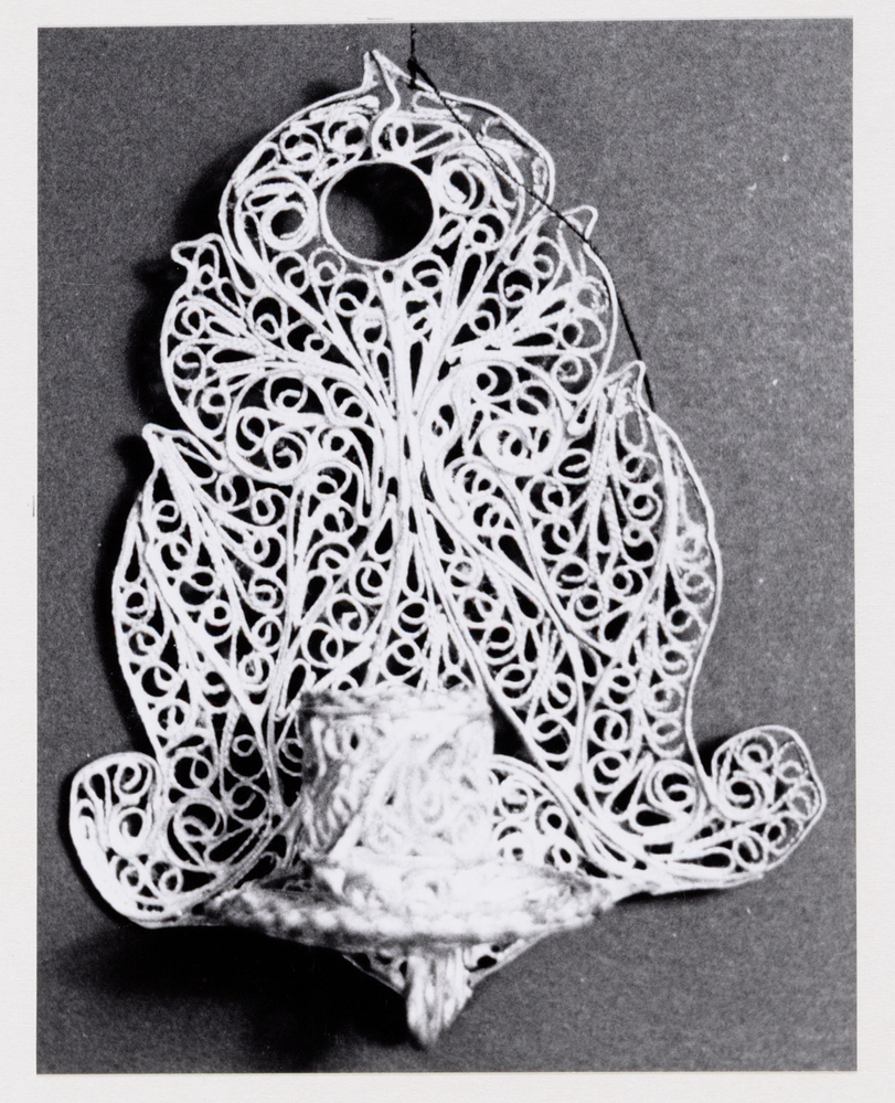 Miniatuur wandluchter geheel in filigrain uitgevoerd, met bladvormig wandstuk. Kaarsenhouder en vetvanger op S-vormig armpje.- Trefwoorden