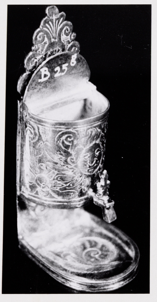 Wandplank met driehoekig geprofileerd en symmetrisch rolwerk op de bovenzijde. Op het half cilindervormige reservoirtje is een cherubijnkopje gegraveerd; in het vlakke, ondiepe lekbakje een slak.- Trefwoorden