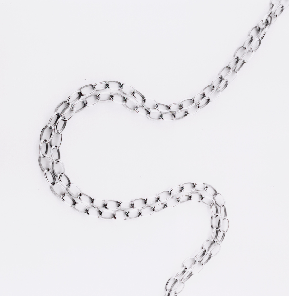 Ketting, samengesteld uit geprofileerde ovale schakels. Gebogen gladde sluithaak.