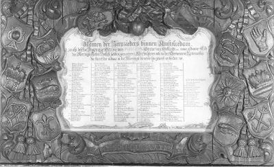 Lijst van de 'Namen der seepzieders binnen Amstelredam', gekalligrafeerd door J. Klumper 1747 (met een aanvulling 'tot heeden toe' (1750). De lijst toont veertien wapenschilden temidden van loofwerk en linten. Aan de bovenzijde het jaartal 1747 en de wapens van de Republiek en Amsterdam. Ter weerszijden van de gekalligrafeerde tekst zes emblemen van zeepziederijen. De linkerreeks geeft van boven naar beneden weer: de Spiegel (Damrak 55), de Keijserscroon (Damrak 22) met de initialen PH (Pieter Haringh?), de Twee Anckers (Damrak 6) met de initialen GD (Gijsbert Dommer?). De tweede reeks: de Gouden Kroon (Damrak 97) met de initialen IVL (Jan van der Linden), de Gecroonde Bruinvis (zuidzijde Looiersgracht, voorbij de Passeerdersdwarsstraat), de Lelie (Anjeliersgracht 202). De derde reeks: de Kroon (Damrak 18), de Zon (Rozenboomsteeg), de Bruinvis (Prinsengracht 327). De vierde reeks: de Vergulde Handt (Damrak 14/15), de Keiserscroon (Anjeliersgracht 49), het Dubbelde Anker (Keizersgracht 8). Wellicht heeft de gesneden lijst deel uitgemaakt van een groter geheel.