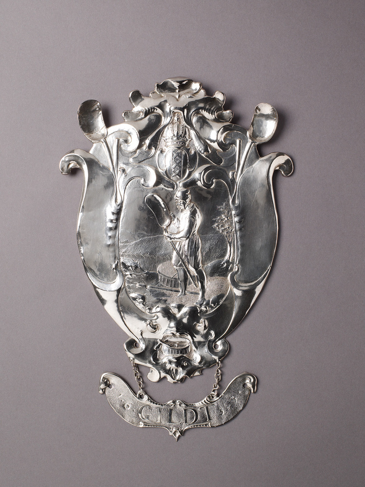 Twee cartouchevormige platen, elk met een medaillon waarin een gedreven voorstelling van een korenmeter, staand voor een korenveld. Naast hem graan, een gevulde korenmaat en een strijkstok. De figuur houdt in zijn linkerhand een schep, met zijn andere hand op de achterzijde van de bak de gemeten hoeveelheid graan aantekenend. Schild toont de korenmeter schuin van voren. Rand opgebouwd uit kwabornamenten met maskerachtige vormen in het midden van onderzijde. In de bovenrand is het gekroonde wapen van Amsterdam opgenomen, in de onderrand een korenmaat met stok. Links- en rechtsboven een stok en een korenmetersschep, de laatste uit de rand stekend. Onder schild hangen twee kettingen waaraan een met kwabornamenten versierde banderol met het opschrift: 16 GILDT 33/. Opschrift op een geruwde ondergrond.- HerkomstVervaardigd voor het Korenmetersgilde, Amsterdam, 1633; hoofdlieden van de Korenwegers- en Korenmeterscorporatie, Amsterdam, 1890; verzameling D. Franken Dzn., Le Vésinet, 1896; geschenk van D. Franken Dzn. aan het Rijksmuseum, Amsterdam, 1896 (4 exemplaren); bruikleen van het Rijksmuseum, Amsterdam, 1975 (2 exemplaren)