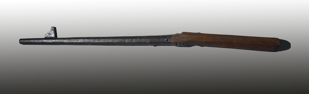 Haakbus, 1440 - 1460 ijzer, hout lengte: 164 cm; breedte: 10 cm; diepte: 8 cm; lengte loop: 95.5 cm; diameter: 3.4 cm; diameter loop: 3.4 cm; merk x: ovaal met 4 balletjes