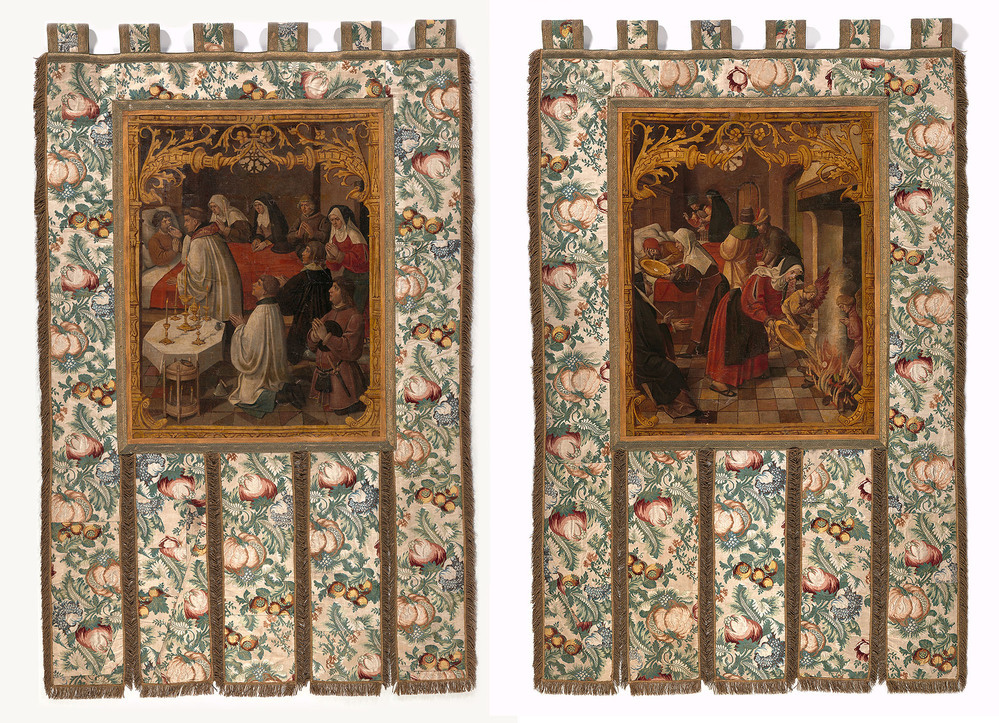 Processievaandel van moderne gebloemde zijde, waarin een aan twee zijden beschilderd doek uit 1555 met taferelen, met betrekking tot het Mirakel van Amsterdam. Op de voorzijde de bediening van de zieke man; op de achterzijde het braken van de zieke man en het werpen van het braaksel met de hostie in het vuur.