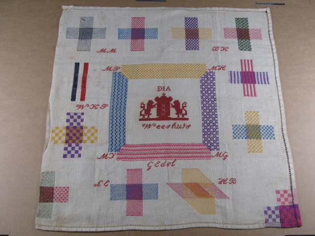 Geertruida Jacoba Edel, kortweg Coby, wordt op 29 juli 1921 in Amsterdam geboren. Ze is een kind uit het eerste huwelijk van schoenmaker Laurens Cornelis Edel (1891) en Henriëtta Maria Bartling, (1892). Uit dit huwelijk worden twee jongens en twee meisjes geboren. Coby is de op één na de jongste. Als Henriëtta in 1931 overlijdt, hertrouwt vader één jaar later met uit Rheden afkomstige Wilhelmina Materman (1895). Daar settelt het paar zich. In 1928 worden de kinderen Edel in het Weeshuis der Nederduitsch Hervormde Diaconie opgenomen. Waarschijnlijk was Henriëtta ziek, te ziek om zorg voor hen te dragen. Coby leerde er handwerken zoals uit deze stoplap blijkt. Ze volgt een voor het weeshuis standaardpatroon, dat vanaf het begin van de twintigste eeuw gebruikt wordt. Rondom een middenkader, waarin ze het stadswapen en de naam van het weeshuis geplaats heeft, heeft Coby, twaalf voornamelijk kruisstoppen geoefend. Aan de onderzijde heeft ze een vlinder- en een hoekstop uitgewerkt. Deze stoppen hadden een hogere moeilijkheidsgraad. De doek meet 55 bij 55 cm. De doek is aan drie zijden omzoomd, de linkerkant uitgezonderd. Daar heeft Geertruida een randstop aangebracht. De doek is niet gedateerd, maar is, op grond van Coby’s leeftijd en soortgelijke doeken in de collectie waarschijnlijk tussen 1930-1935 gemaakt. Hoe het Coby na haar verblijf in het weeshuis is vergaan is niet bekend Na de Tweede Wereldoorlog verhuist Coby naar Groningen waar ze Antonius Marinus Koelen (1924-1998), haar Toon, ontmoet, met wie ze op 7 juli 1947 in Venlo trouwt. Het paar krijgt twee zonen en twee dochters. Op 7 juli 2008 overlijdt ze in Venray, kort na haar 87ste verjaardag.