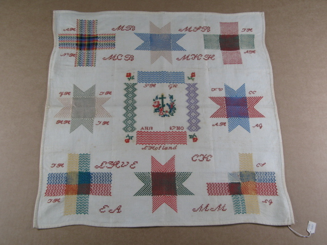 Leentje Hofland, wordt op 21 december 1871 geboren in het Overijsselse Ambt Ommen. Ze is de dochter van Pieter Hofland (1835-1885) en Geesje Kuiper (1843-1882). Uit dit huwelijk dat in 1862 gesloten wordt, worden drie dochters en een zoon geboren: Ymke (1864), Leentje (1871), Johannes (1875) en Anna (1877). Als haar moeder in 1882 overlijdt, hertrouwt vader enkele maanden later met de bijna zeventien jaar jongere Tettje de Vries (1852) uit Friesland. Dit huwelijk blijft kinderloos. Tettje wordt niet geschikt geacht om de kinderen onder haar vleugels te nemen. Als in 1885 ook vader overlijdt, worden de kinderen uit huis geplaatst. Op 26 januari 1886, wordt de aanvraag tot plaatsing in het Weeshuis der Nederduitsche Diaconie voor Leentje, Johannes en Anna goedgekeurd. Bij de vraag of ‘de weezen zonder gevaar kunnen verkeeren”, wordt in het dossier aangetekend dat het niet wenselijk is dat zij veel met hun tweede moeder in aanraking komen. De kinderen worden bevoogd door hun oom Jan Frederik Hofland en zijn vrouw. Ymke, die oudste van het stel, is inmiddels twintig jaar en gaat haar eigen weg. Enkele jaren later overlijdt Leentje op 4 maart 1890. Ze is dan achttien jaar. Haar stoplap toont alle kenmerken van een Diaconie-doek. Deze doeken kwamen op het eerste oog sterk overeen met Burgerweeshuis doeken. Rondom een middenkader waarin een geromantiseerd motief is aangebracht – in dit geval een door rozen omgeven kruis - worden altererend vier kruis – en vier sterstoppen geoefend. De initialen tussen de stoppen verwijzen naar personeel van het weeshuis, familie en soms vriendinnetjes. Opvallend zijn de gekroonde initialen rondom de sterstop aan de bovenzijde. Zij behoren de vier regentessen toe. Deze dames van goeden huize werden moeders genoemd. De tweede letter verwijst naar hun achternaam. De Diaconie-doeken onderscheiden zich van de Burgerweeshuisdoeken, doordat de initialen de schrijfrichting blijven volgen en niet meedraaien met de klok, ook worden de persoonlijke gegevens van de borduurster in, net onder of boven het middenkader geplaatst. De achtste stop is een winkelhaakstop, die een hogere moeilijkheidsgraad heeft. Het handwerk van de Diaconie stond op een zeer hoog peil, evenals dat van het Burgerweeshuis. Leentje legde in 1887 de laatste hand aan deze doek van groot formaat die 47,5 bij 46,5 meet. Ze werkte met zijden garen op een fijngeweven katoenen ondergrond. De doek is door de Diaconie in langdurige bruikleen gegeven aan het museum.