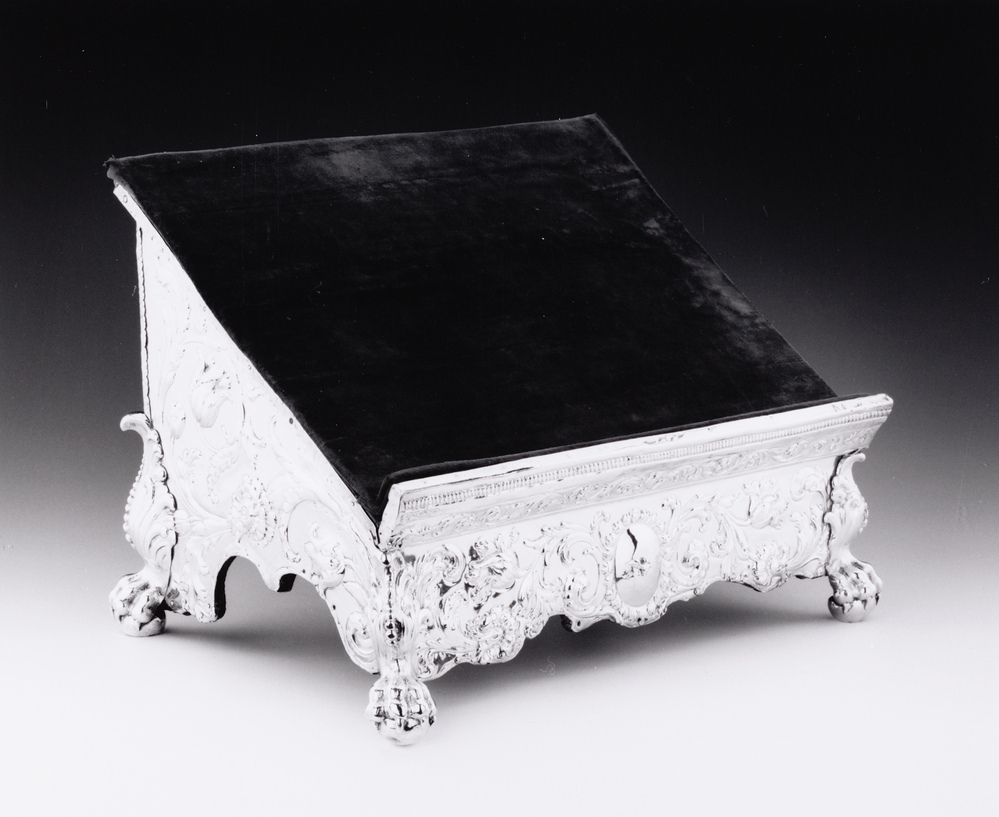 Rechthoekige kerklezenaar met onderstel van notenhout, gemonteerd met gedreven, deels geponst zilver. Vier klauwpoten met bal, de bovenzijde uitlopend in overhoeks geplaatste acanthusbladeren met parellijst. Hoge achterzijde, lage voorzijde en beide afgeschuinde zijkanten met gecontourneerde onderrand. Alle zijden versierd met symmetrisch patroon van bladvoluten en deels naturalistisch weergegeven bloemen. Te onderscheiden bloemsoorten zijn: tulp en trompetnarcis. Voorzijde met centraal glad medaillon, opgelegd met een duif met gespreide vleugels van later datum. Voorzijde met verhoogde rand, waarop een met rood fluweel beklede kartonnen plaat van later datum.