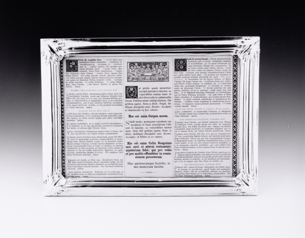 Rechthoekig canonbord met geprofileerde lijst en binnenrand van zilver op eikenhouten kern. De hoeken opgelegd met deels geruwde acanthusbladeren, de punten afgebroken. Op onderzijde lijst is gegraveerd: Alida Burgert is bagijntie geworden op den dagh Van onze Lieve Vroü Viesetasij 1726/. Achterzijde met vaste uitzetsteun van eikenhout. Lijst gemonteerd met glas.