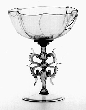 Helder kleurloos glas, helder blauw glas. Platte voet. Holle geribde balusterstam met twee knopen. Twee vleugels met geknepen kammen van blauw glas. Wijde zevenlobbige kelk. Blauwe glasdraad op mondrand.