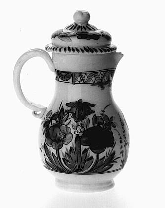 Materiaal, vorm en beschildering van het kannetje zijn sterk be‹nvloed door voorbeelden van met name Meissen en Wener porselein. ( Annemarie den Dekker)