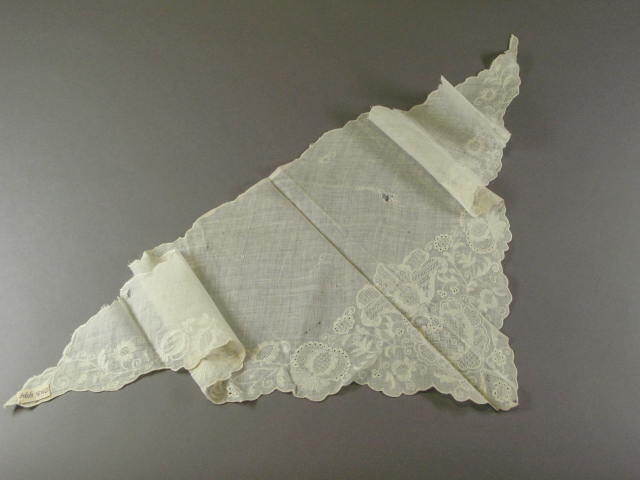 Witte halsdoek of fichu van geborduurd wit linnen, met geschulpte rand. Drie stoppen.- HerkomstAfkomstig uit de collectie van het Kunstnijverheidmuseum te Haarlem; bruikleen Nederlandsche Maatschappij voor Nijverheid en Handel, Haarlem, 1934.