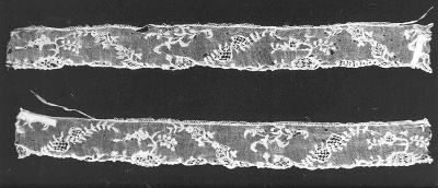 Twee stroken kant, met bloemmotief en bladermotief. Samen met KB 1846.1/2 de garnering van een 18de eeuwse muts.- HerkomstAfkomstig uit de collectie van het Kunstnijverheidmuseum te Haarlem; bruikleen Nederlandsche Maatschappij voor Nijverheid en Handel, Haarlem, 1934.