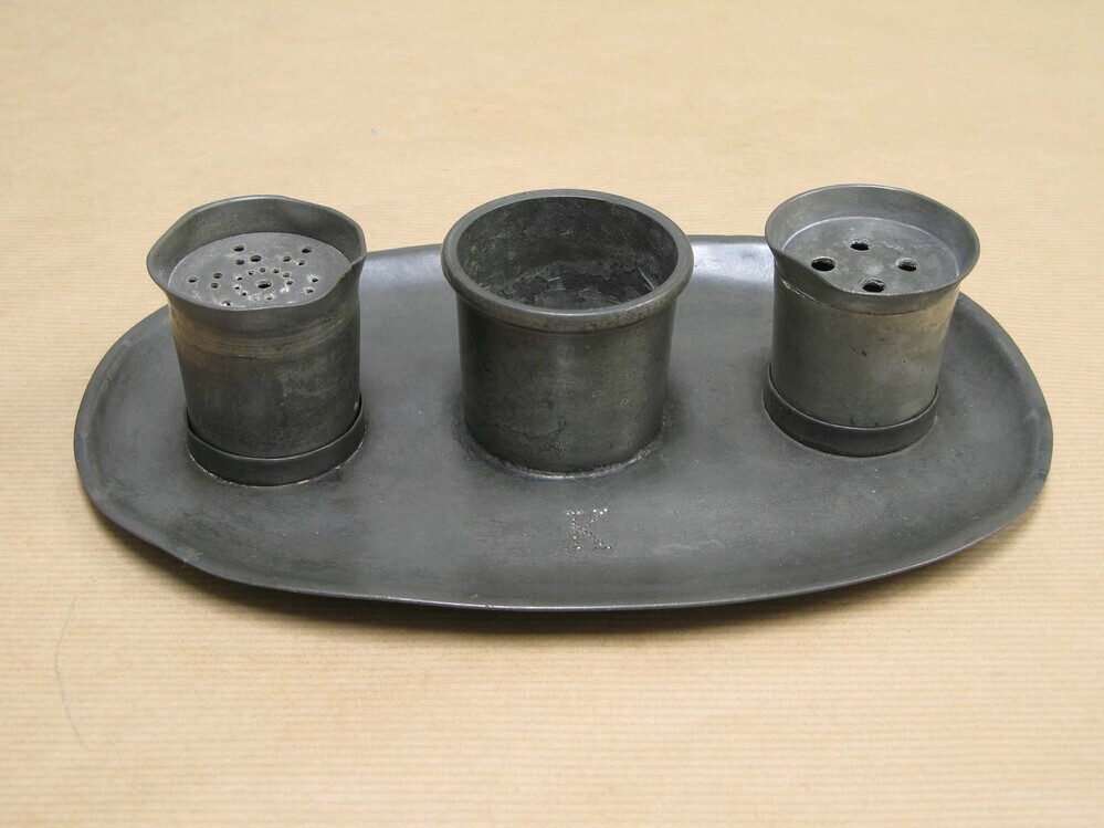 In het Amsterdamse Burgerweeshuis konden kinderen van Amsterdamse poorters (burgers met rechten om in de stad te wonen) terecht, die geen ouders of een moeilijke thuissituatie hadden. Jonge weeskinderen kregen in klasverband les in onder meer lezen en schrijven. Waarschijnlijk werd daarbij gebruik gemaakt van dit soort tinnen inkstellen. De wat oudere weesjongens en –meisjes leefden veelal een gescheiden bestaan. Terwijl de oudere jongens overdag buiten de deur een ambacht leerden, bleven de grote meisjes binnen, waar ze opgeleid werden tot nette huisvrouw. ( Sarah Remmerts de Vries)