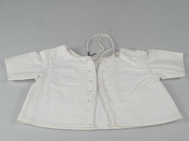 Hemdje gemaakt van zware keperkatoen, schaal 1:4, waarschijnlijk gemaakt op naaionderricht, gegeven aan de meisjes van het Burgerweeshuis. Zonder hals, korte mouwen; sluiting middenachter d.m.v. vijf nestels aan weerszijden.