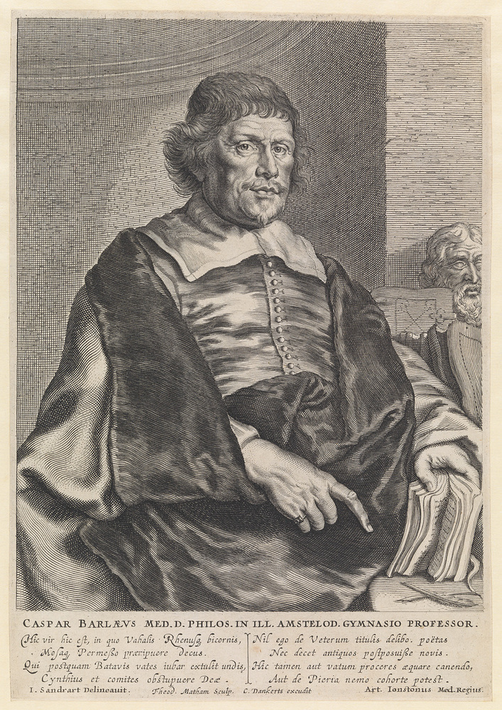 onderschrift middenonder: naam en titel an geportreteerde (CASPAR BARLAEUS MED.D. PHILOS. IN ILL. AMSTELOD. GYMNASIO PROFESSOR) met daaronder acht regels Latijnse tekst: Hic [...] potest. - aankoop 1980-03-25
