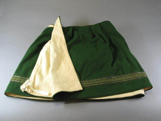 Groen gordijn met zeven plooien, met beige katoen gevoerd, onderrand afgezet met band.- Trefwoorden