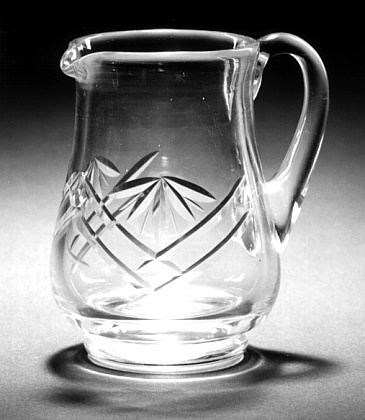 Helder kleurloos glas. Platte ingesnoerde voet. Bolvormig lichaam, overgaand in slanke hals met schenktuit. C-vormig oor. Op lichaam twee geslepen palmetten en dubbele diagonale lijnen.- Trefwoorden