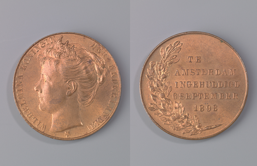 Inhuldiging van Koningin Wilhelmina, 1898 onbekend koper, metaal omschrift voorzijde: WILHELMINA KONINGIN DER NEDERLANDEN
