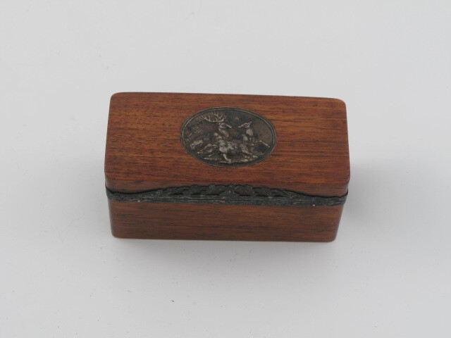 - opschrift ovaal zilveren medaillon op deksel: afbeelding van 2 herten