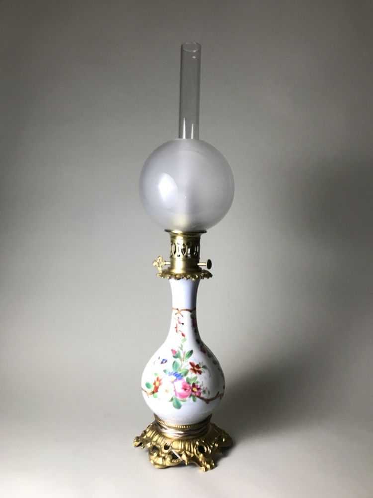 Olielamp, 1800 - 1899 brons, keramiek, messing, blik hoogte: 46 cm; diameter: 17.5 cm; diameter: 15 cm; gewicht: 2144.2 gr; hoogte: 30 cm; diameter: 5 cm; hoogte: 15 cm; diameter: 16 cm; hoogte: 69 cm; bruikleen 1989-01-01 inv.nr. KB 2300 in depot olielamp in de vorm van een balustervormige vaas met een gedecoreerd glazuur en bronzen monturen, bol gematteerd glas en helder trekglas.
