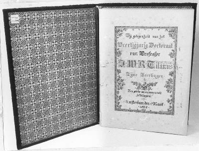 tekst titelblad: Bij gelegenheid van het/Veertigjarig Doctoraat/van Professor/J.W.R. Tilanus/Zijne Leerlingen/Ten geleide van een bronzen beeld/,,le Vainqueur.''/ Amsterdam den 2dn Maart/1889
