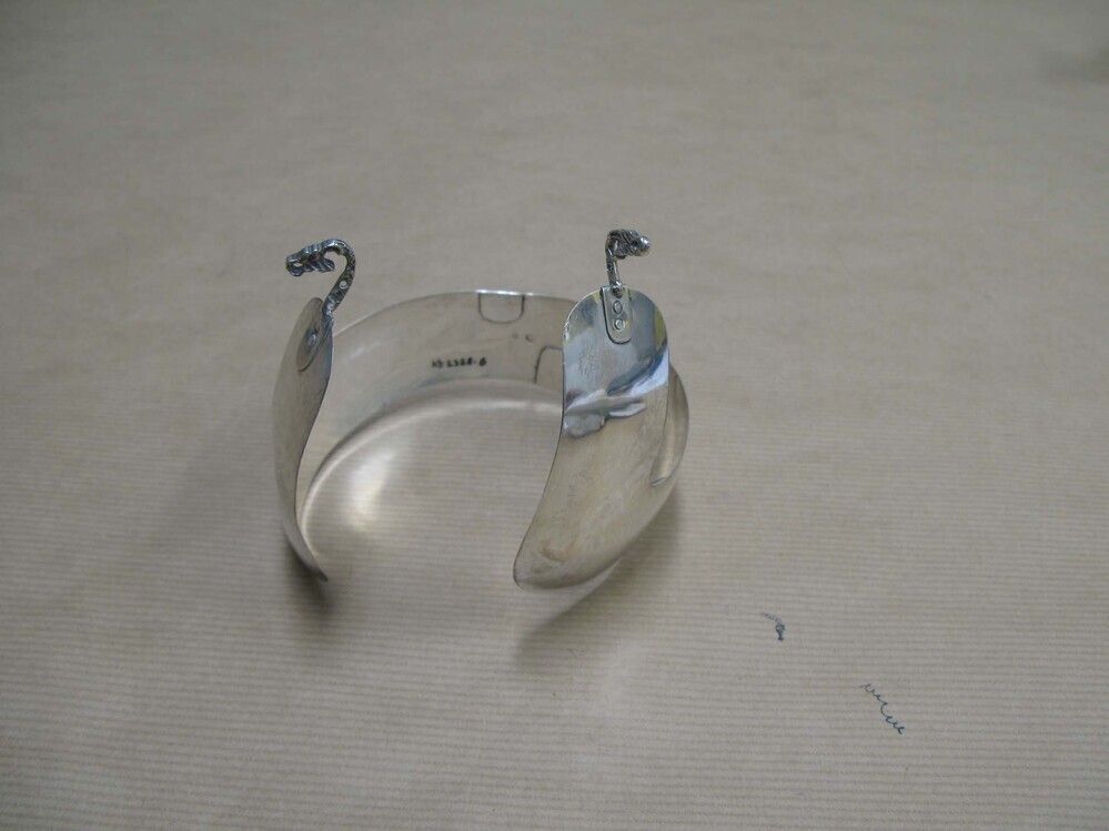 Rond staand- en hol gesmede platte band van dun zilver, beide uiteinden met aangeklomken ornament met een drakenkop.