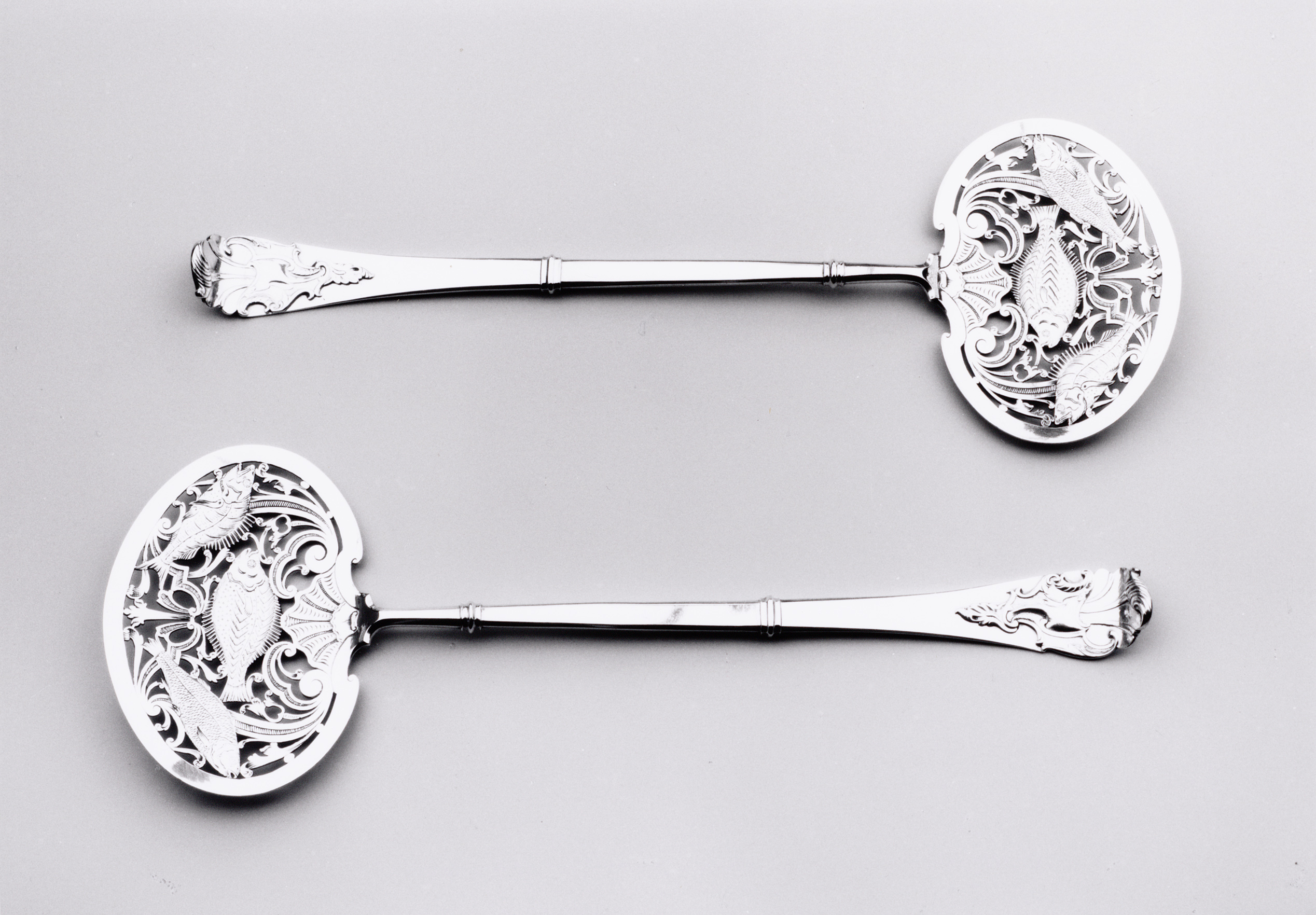 Twee visscheppen, elk met gefacetteerde steel verbonden met ovaal blad dwars op de steel, aan de achterzijde dubbel lof. Steel met twee geprofileerde banden, de kop met opgelegd rocailleornament. Blad opengewerkt met drie verschillende soorten gegraveerde vissen omgeven door symmetrische bladvoluten, binnen gladde omranding. Schelpmotief bij aanzet steel. Op achterzijde steel is een duif in een stralenkrans gegraveerd, symbool van de Heilige Geest en embleem van het Burgerweeshuis te Amsterdam.