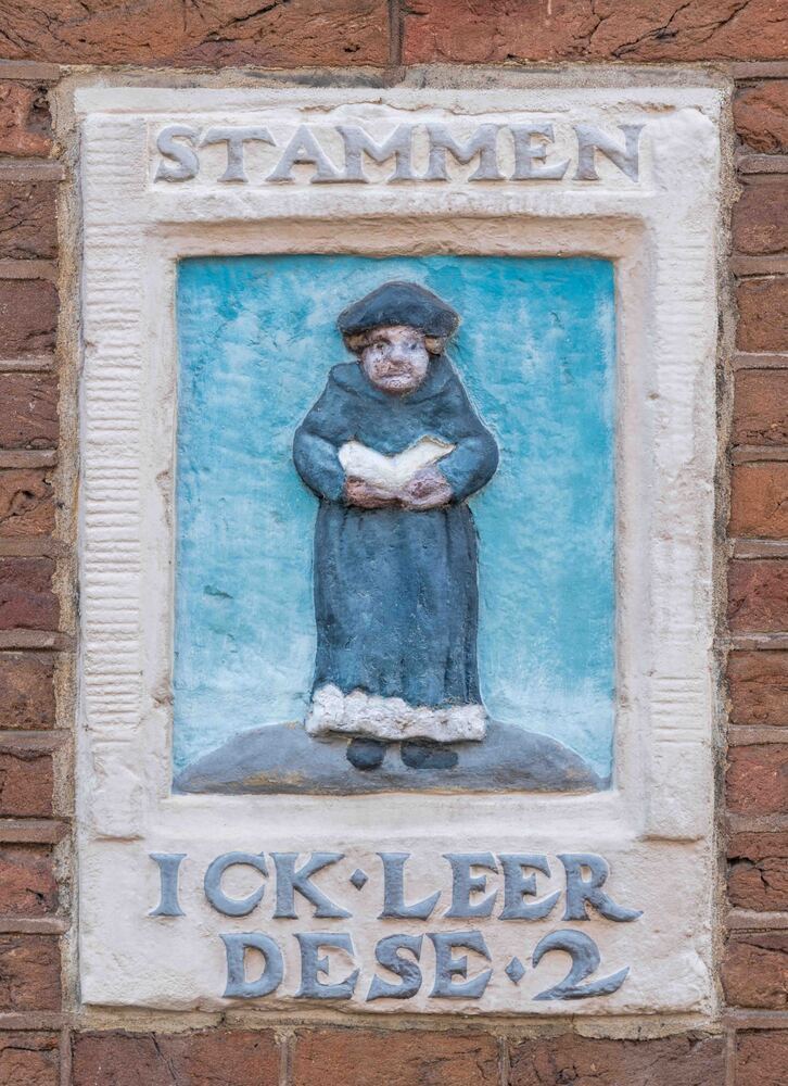 'ICK LEER DESE 2', gevelsteen zandsteen hoogte: 50 cm; breedte: 35 cm; opschrift bovenrand: STAMMEN