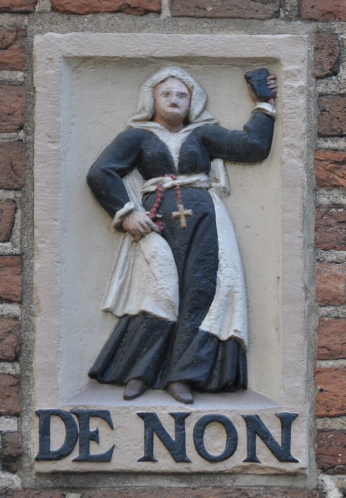 Staande non met boek in haar opgeheven linkerhand.- Trefwoorden