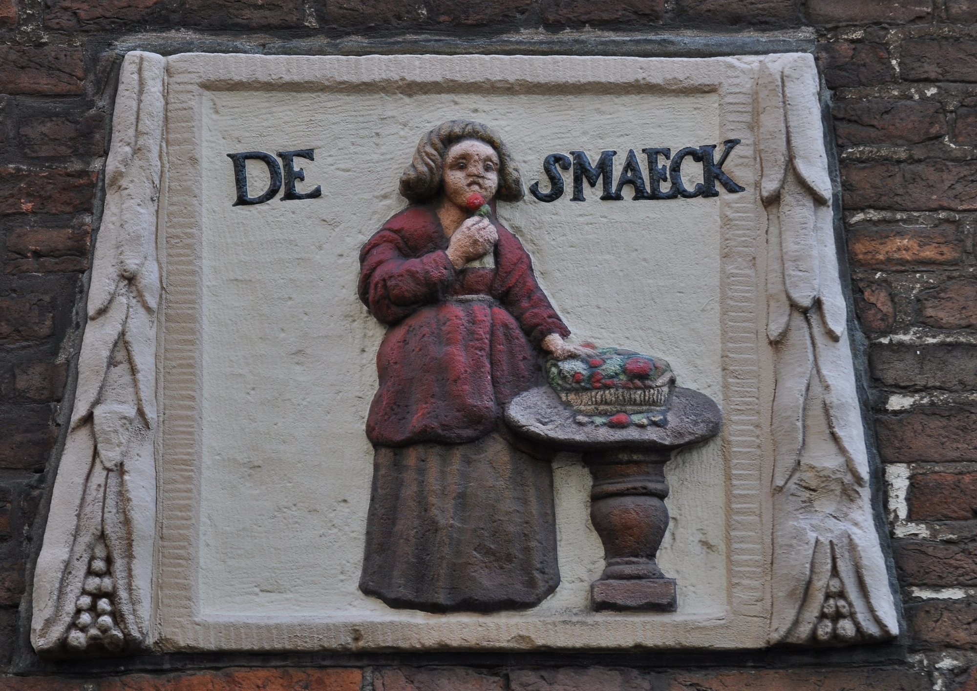Gevelsteen met een staande vrouw bij een tafeltje. Op het tafeltje staat een mandje waaruit de vrouw iets eet. De tekst langs de bovenrand is: DE SMAECK.