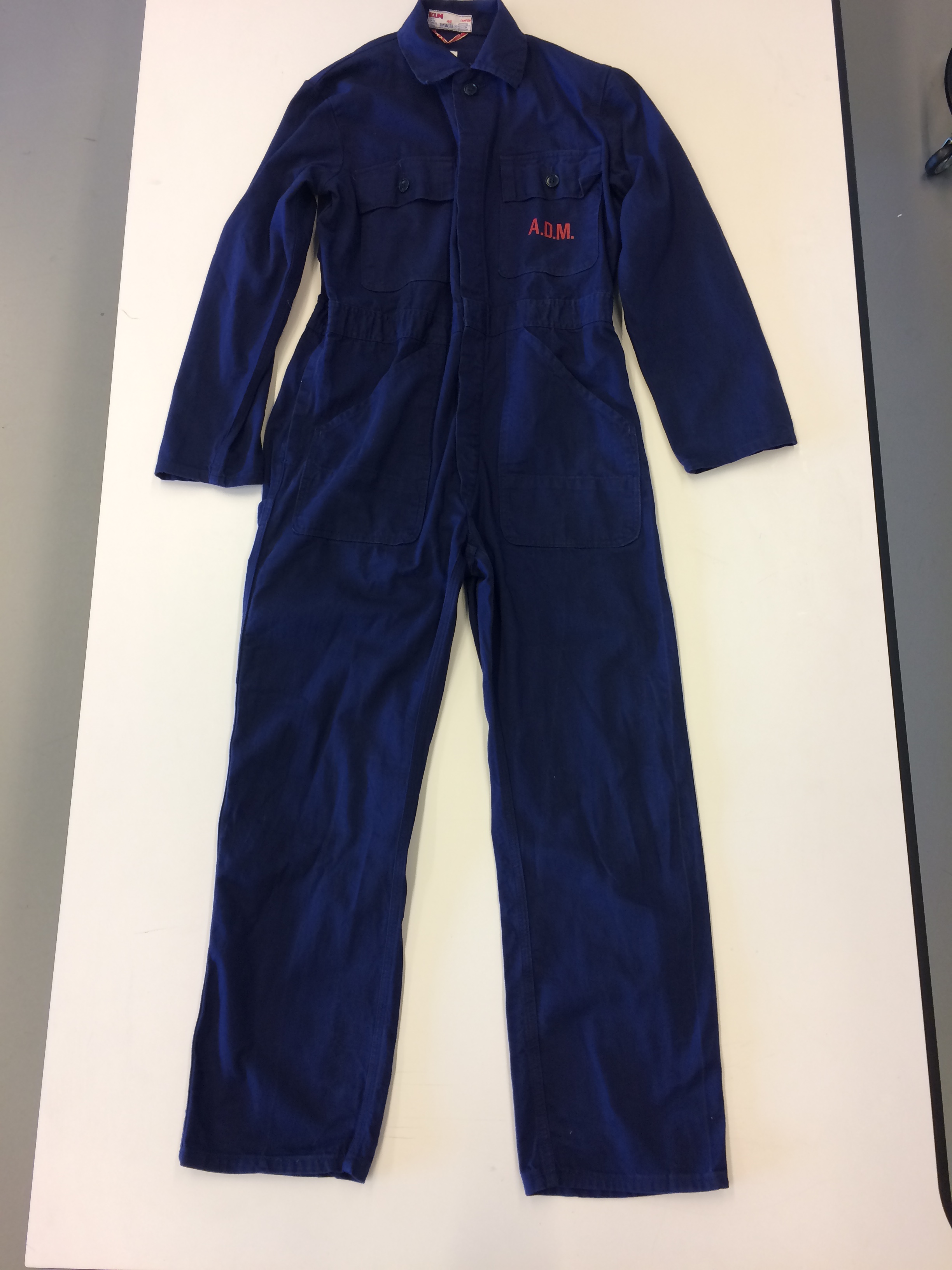 Overall of pak van donkerblauwe katoen in keperbinding. Ronde hals met puntige platte kraag. Lange mouwen, bestaande uit twee panden. Aan de voorzijde twee opgenaaide borstzakken met klep en kunststof knoop. Op de linkerborstzak in rood de opdruk: A.D.M. (Amsterdamse Droogdok Maatschappij). Blinde sluiting middenvoor (behalve de bovenste knoop) met zes donkerblauwe kunststof knopen en knoopsgaten.
