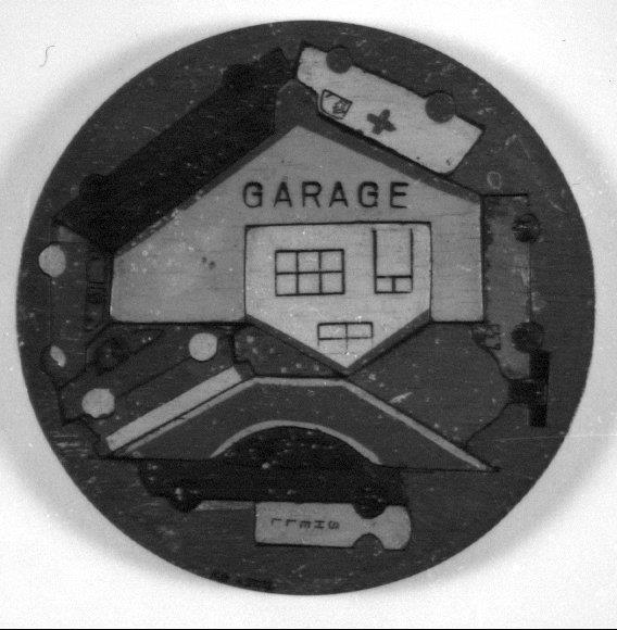 Ronde puzzle. Kleuren rood, geel, groen. Puzzlestukjes: Garage, auto's, ziekenauto, benzinepomp- Trefwoorden