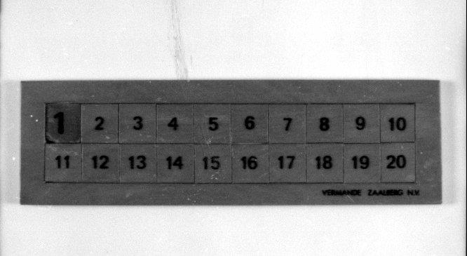 Rechthoekig, blank gelakt , plankje, met twintig losse stukjes waarop in zwart de cijfers 1 tot en met 20.- Trefwoorden