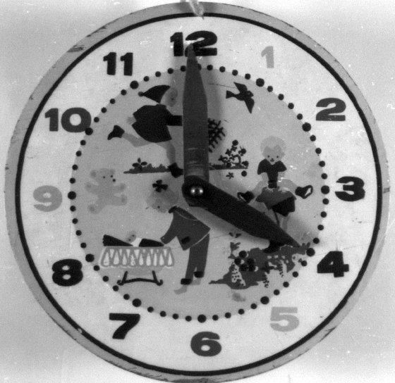 Ronde klok, rode wijzers. In het midden, op lichtblauwe achtergrond: vrouw met wieg, spelende kinderen, hollend meisje met t.as- Trefwoorden