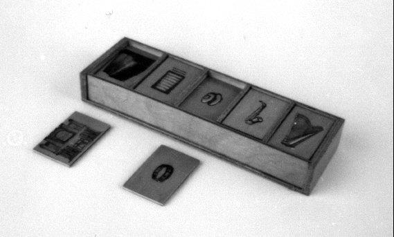 Rechthoekige, blank gelakte doos, één zijde uitschuifbaar. De doos is onderverdeeld in vijf vakken, per vak zes houten fiches met afbeeldingen van muziekinstrumenten.- Trefwoorden
